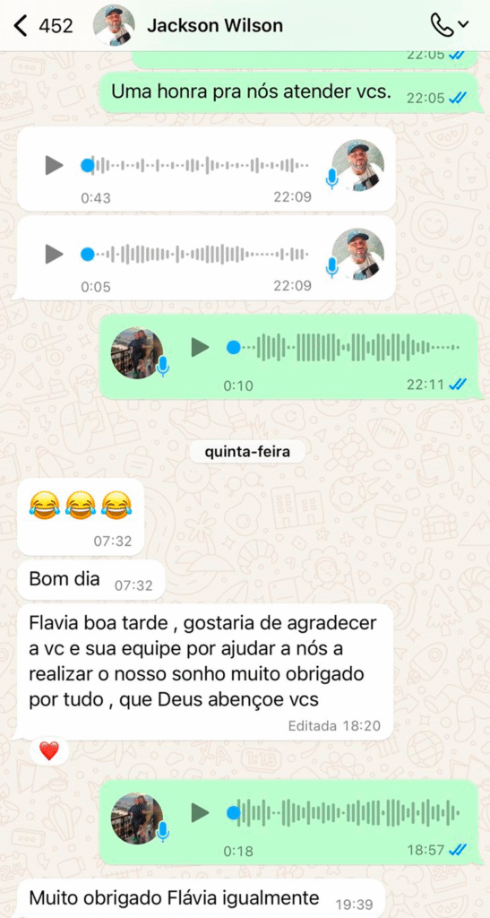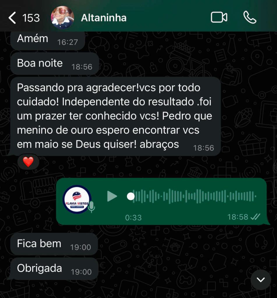 Cada visto aprovado é uma conquista única — e também um orgulho para nós. Nesta página, reunimos relatos de clientes que confiaram na Flavia Vistos para guiar seus processos. De perfis simples a casos desafiadores, essas histórias mostram que, com orientação certa, o visto americano pode ser uma realidade.